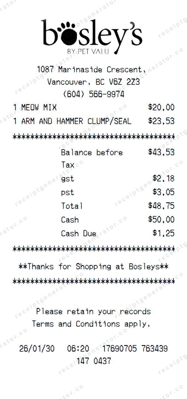 Create a realistic Bosley’s - Pet Valu receipt with our free online generator. This retail receipt template replicates the authentic Bosley’s - Pet Valu format, complete with the correct layout, fonts, and structure. Sample items like "MEOW MIX", "ARM AND HAMMER CLUMP/SEAL" are pre-filled to give you a head start, but every field is fully editable.