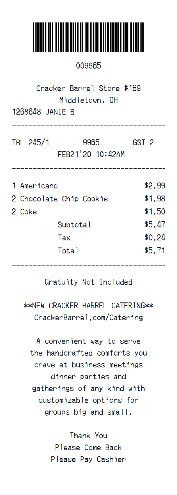 A white thermal restaurant receipt from Cracker Barrel Old Country Store, showing location details for Store #169 in Middletown, Ohio. The receipt includes a barcode header, server identification (JANIE B), table and guest numbers, and a transaction timestamp dated February 21, 2020 at 10:42 AM. It presents subtotal, tax, and total amount due with a gratuity notice, followed by promotional catering information and a standard closing footer asking the customer to pay the cashier and return again. The layout reflects a typical dine-in POS restaurant receipt format used across U.S. Cracker Barrel locations.