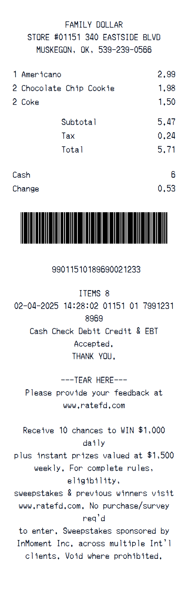 This receipt is issued by Family Dollar, a discount retail store, and includes store identifier #01151 with a listed address on Eastside Blvd in Muskegon and a printed contact phone number. The format follows a standard retail POS structure with clearly itemized entries, barcode references, and tax classification indicators. It includes a timestamp (02-04-2025 14:28:02), transaction identifiers, and register/session details embedded within the receipt footer. The financial summary section presents subtotal, multiple tax lines (TAX1 and TAX2), total amount, payment method (cash), and calculated change. Additional elements include a barcode string, item count, accepted payment methods (cash, check, debit, credit, EBT), and a structured promotional footer encouraging customer feedback via an external survey platform. The receipt also features a tear line separator and sweepstakes promotional messaging, consistent with large-scale retail POS receipt formats.