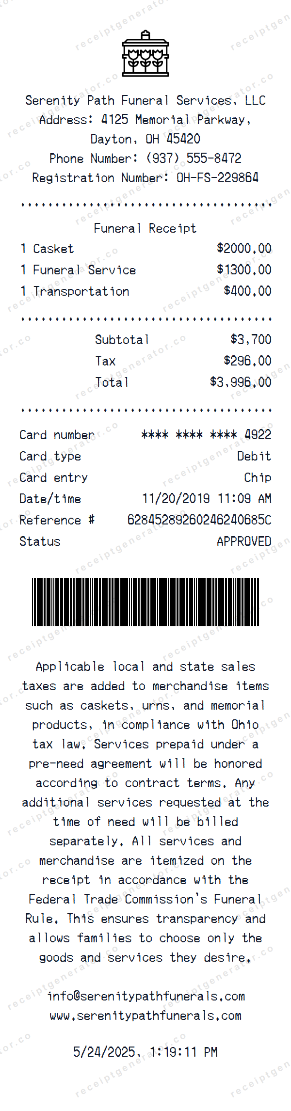 Our Funeral receipt generator lets you create professional, authentic-looking custom receipts in seconds. Whether you need to recreate a lost receipt, build a mockup for business purposes, or create materials for educational projects, this template provides the exact layout and formatting used by Funeral. Sample items like "Casket", "Funeral Service", "Transportation" are pre-filled to give you a head start, but every field is fully editable.