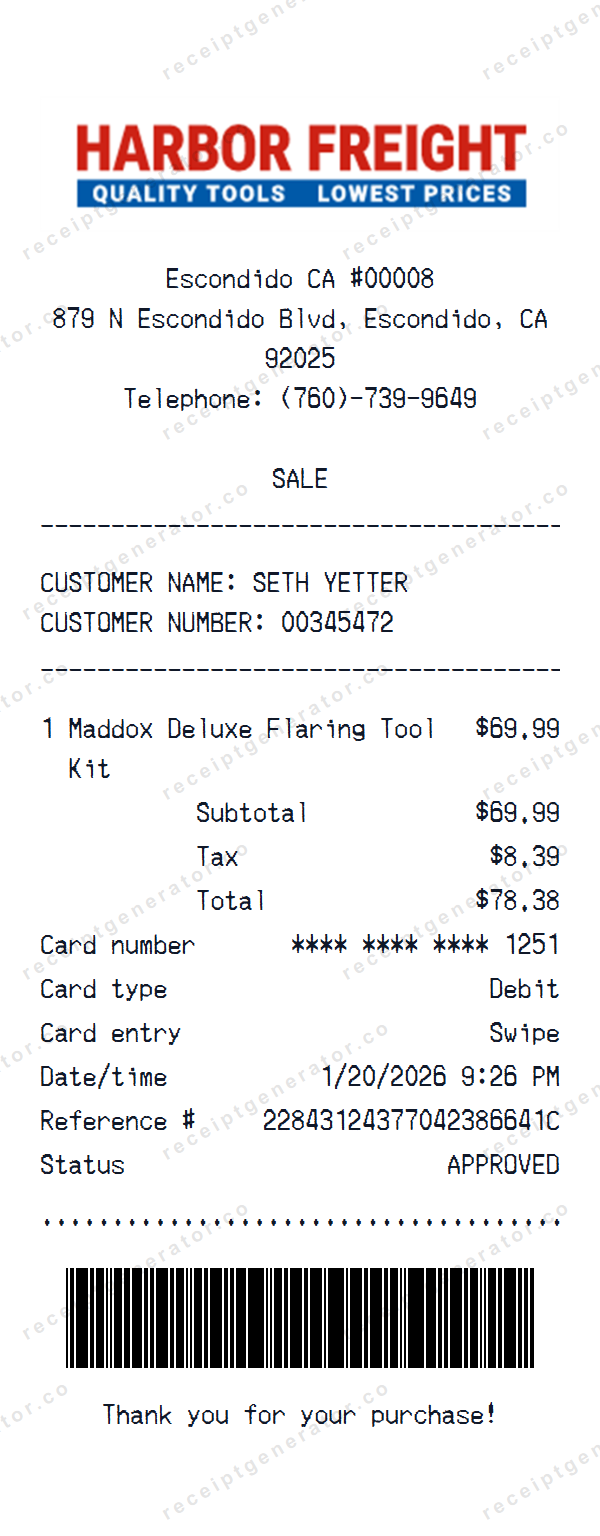 Our Harbor Freight Tools receipt generator lets you create professional, authentic-looking retail purchase receipts in seconds. Whether you need to recreate a lost receipt, build a mockup for business purposes, or create materials for educational projects, this template provides the exact layout and formatting used by Harbor Freight Tools. Sample items like "Maddox Deluxe Flaring Tool Kit" are pre-filled to give you a head start, but every field is fully editable.