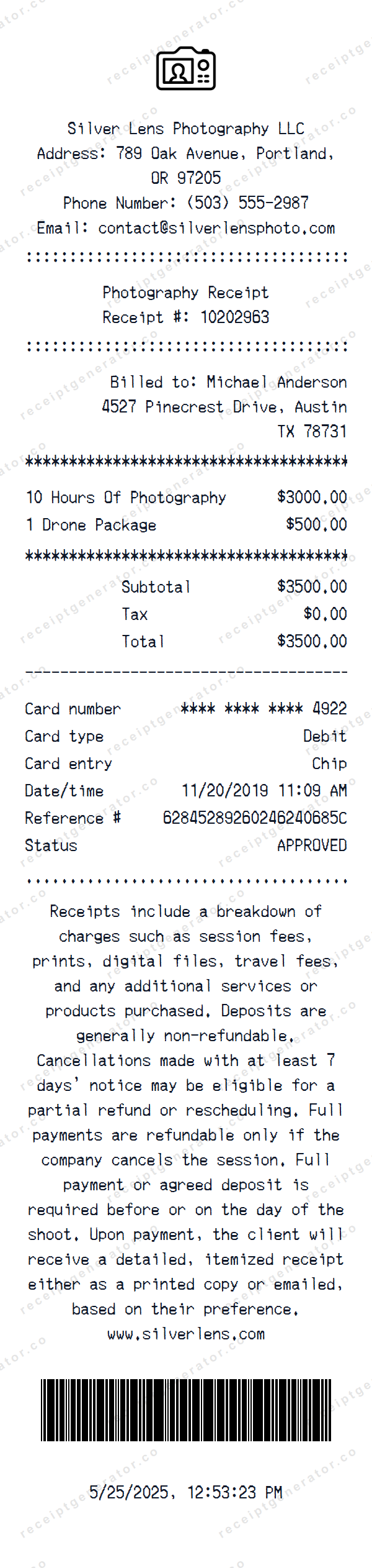 Create a realistic Photography receipt with our free online generator. This generic receipt template replicates the authentic Photography format, complete with the correct layout, fonts, and structure. Sample items like "Hours Of Photography", "Drone Package" are pre-filled to give you a head start, but every field is fully editable.
