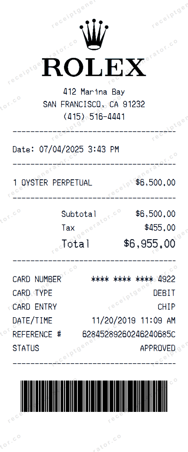 Customize every aspect of your Rolex receipt including store information, line items, pricing, and payment method. This template includes a realistic barcode, the official store logo, automatic tax calculation, date and time stamps, matching the authentic Rolex receipt format. Payment details including card type, masked card number, approval code, and transaction reference are all customizable.