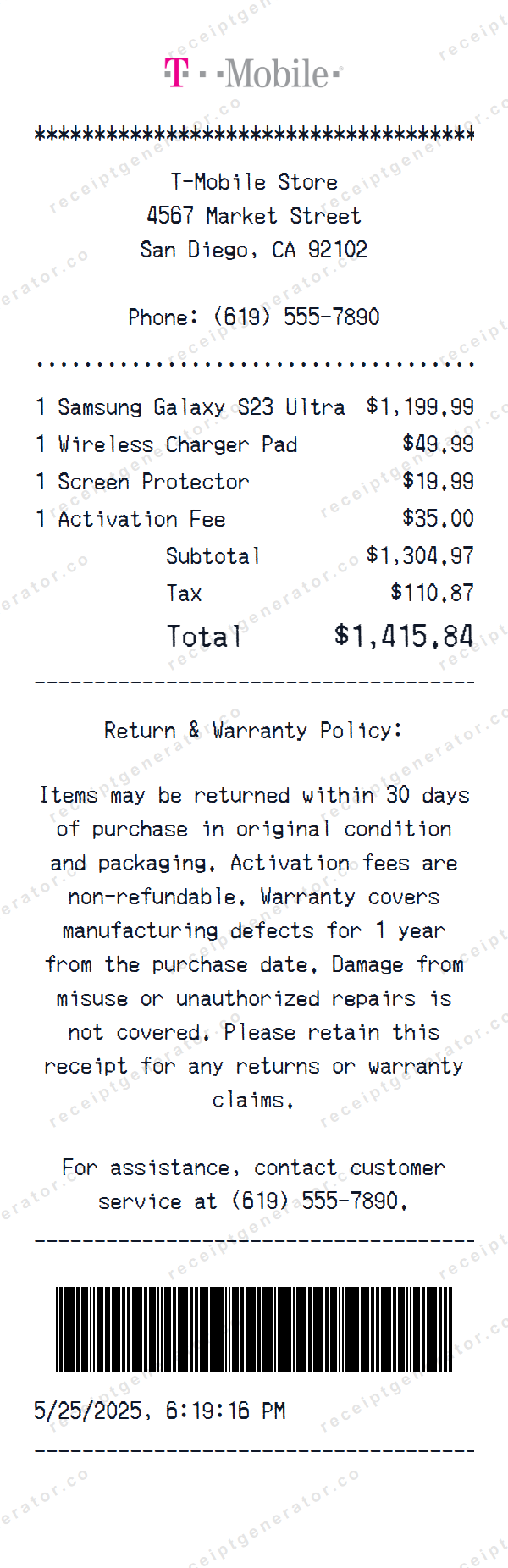 Our T Mobile receipt generator lets you create professional, authentic-looking retail purchase receipts in seconds. Whether you need to recreate a lost receipt, build a mockup for business purposes, or create materials for educational projects, this template provides the exact layout and formatting used by T Mobile. Sample items like "Samsung Galaxy S23 Ultra", "Wireless Charger Pad", "Screen Protector" are pre-filled to give you a head start, but every field is fully editable.